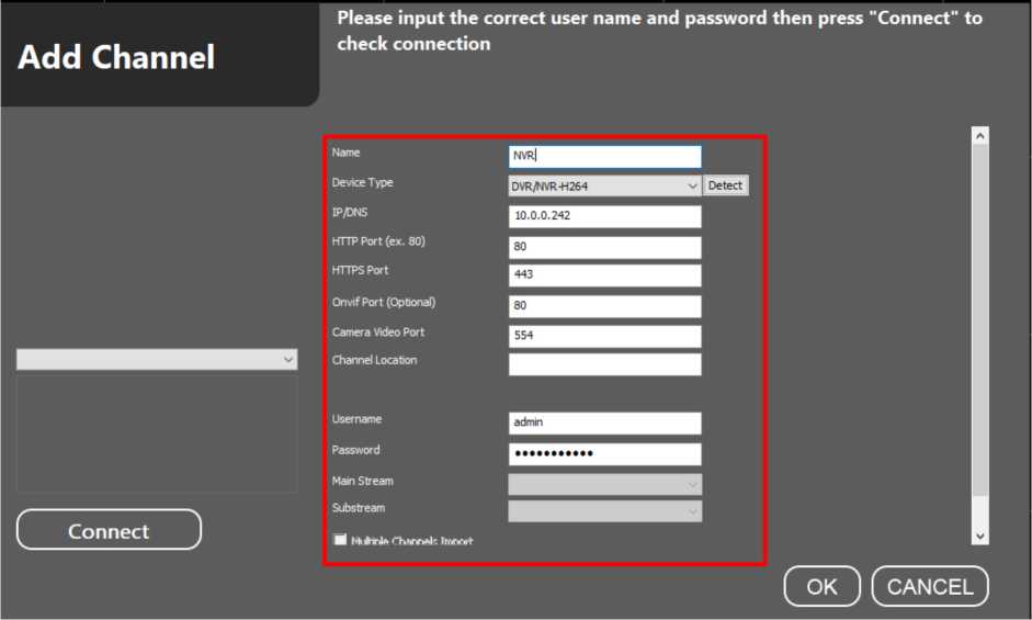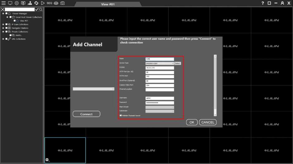 - Click ‘Connect’ on the left-hand side to check the connection. If all of the device details have been entered correctly, the client will now connect to the device and show a preview of the first camera just above the connect button.