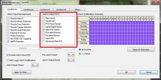 Within the alarm management’s ‘Alarm Input’ section you will see an ‘ANPR Detection’ check box, ensure this is checked, you will also need to ensure something is also checked in the ‘Alarm Output’ section.