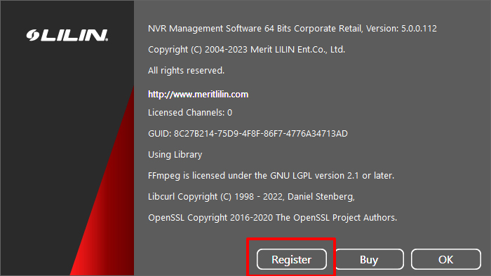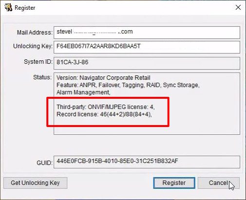 Run the Nav software and click the ? icon in the top right hand side. You will get a popup box, confirm that the ‘Third-party’ section has a value after it. This is the amount of ONVIF cameras your licence will allow you to use.