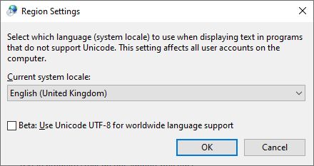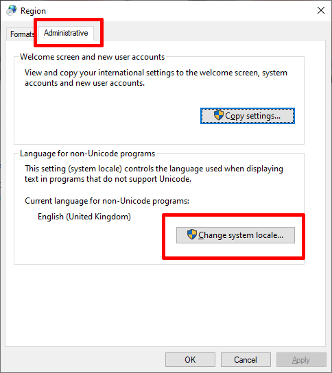 6) Another region related box will pop-up, select the ‘Administrative’ tab at the top and then ‘Change System Locale…’