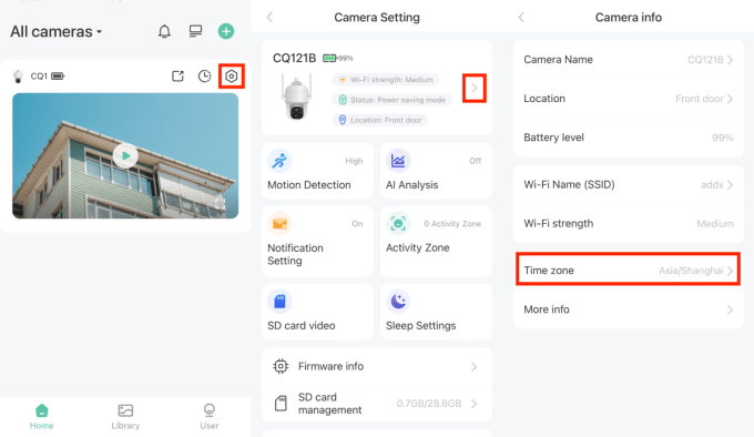 How to change time zone: tap the camera “setting” icon > tap the “>” extension icon > tap “More info” > tap “Time Zone”.