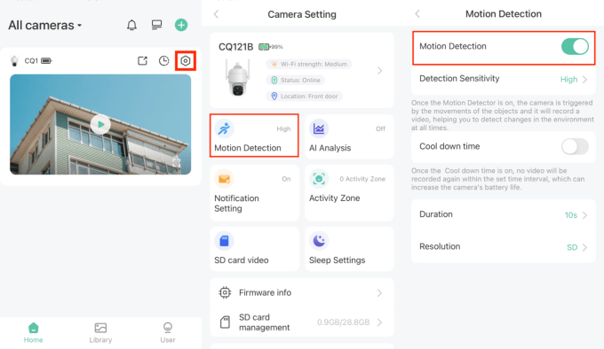 To enable the motion detection feature, please tap the camera “setting” icon > tap “Motion Detection” > enable “Motion Detection”.