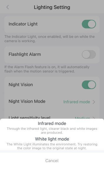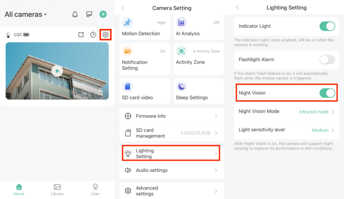 To enable “Night Vision”, please tap the camera “setting” icon > tap “Lighting Setting” > enable “Night Vision”.