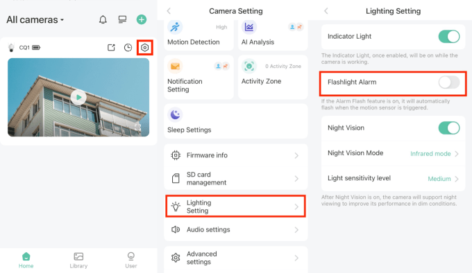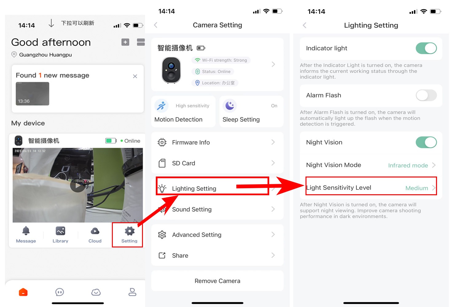 To adjust the sensitivity, please tap the camera “setting” icon > tap “Lighting Setting” > tap “Light sensitivity level”.