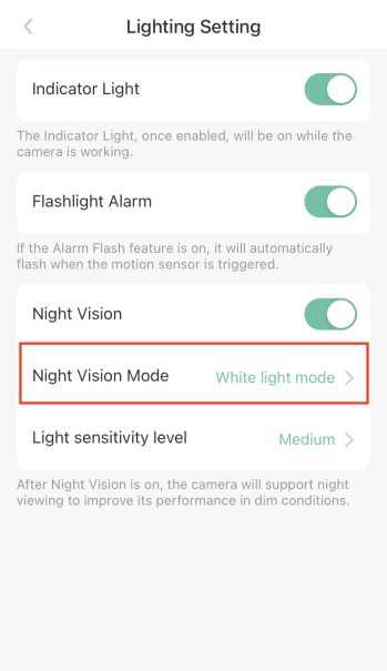 However, if you want the camera’s white light/spotlight to be on constantly in the dark or at night, you can turn off “Flashlight Alarm” and set “Night Vision Mode” as “White light mode” instead.
