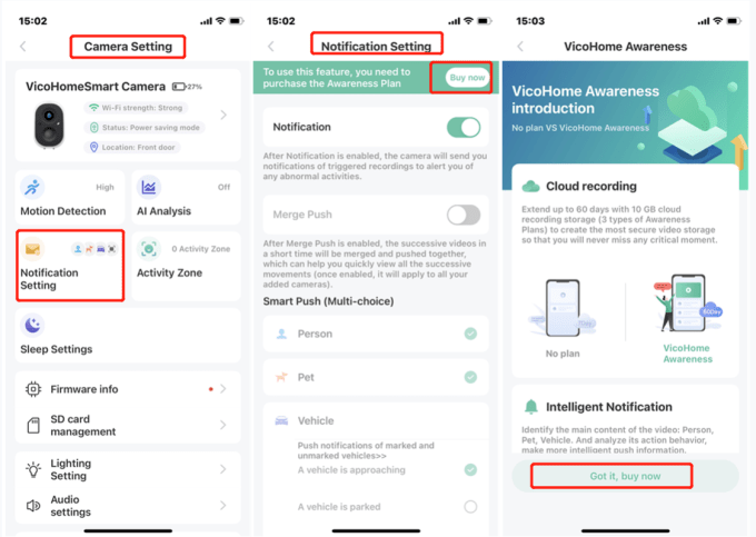 Or you can open Camera Setting to click Notification Setting to tap Buy now.