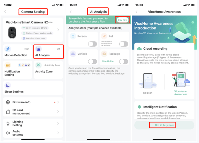Also, you can open Camera Setting to click AI Analysis to tap Buy now.