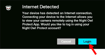 6.The Internet Detected message displays on the recorder screen. Click Login.