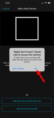 Night Owl standalone cameras are Wi-Fi devices that can be added to the Night Owl Protect app either by scanning its QR code, by using the network discovery method, or using the camera’s serial number. All methods are described below. See your camera’s setup instructions for further details.