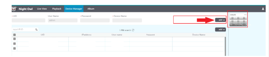 - After you have filled in those values, click on the add tab to add your device to the Night Owl X CMS software. Your recorder should now appear in the top right corner of the screen in a thumbnail image.