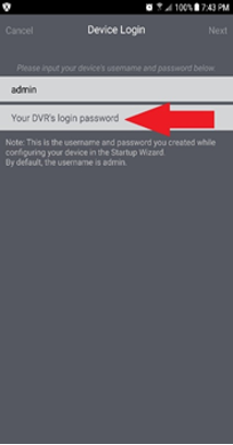 NOTE: This is not the password you created in the app. The password you enter here will be the password for your recorder (DVR/NVR), which should be stored in your Quick Setup Guide. DO NOT enter the password for the app, as this will produce an error message.