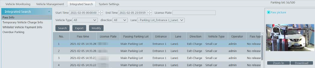 In this interface, you can search the information of the vehicles entering and leaving the parking lot.