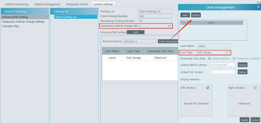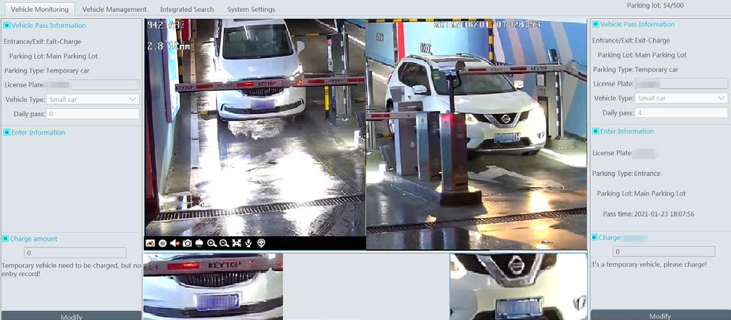 If the lane type is set to “Exit-Free”, the temporary vehicle will be able to pass automatically; if the lane type is set as “Exit-Charge”, the temporary vehicle will be able to pass after the owner pays the parking fee according to the established temporary vehicle charging rule.