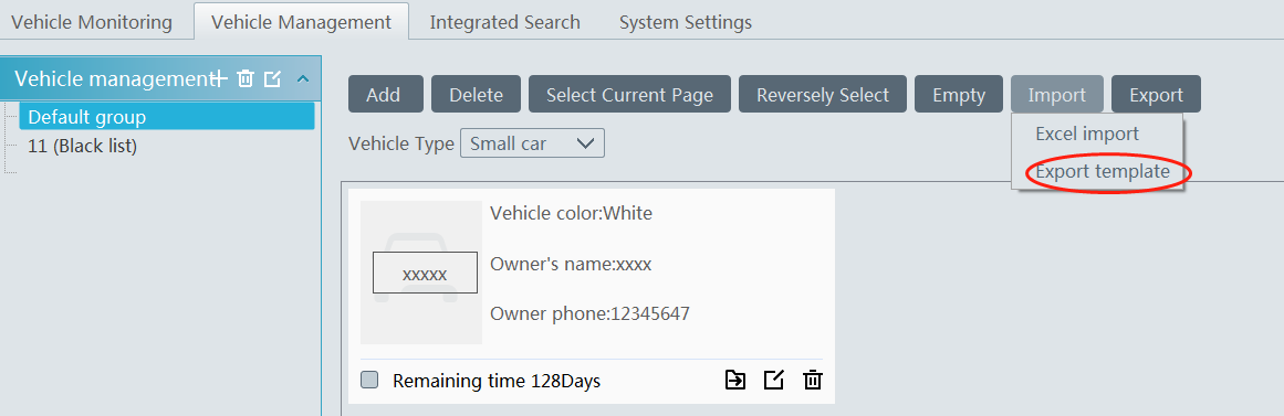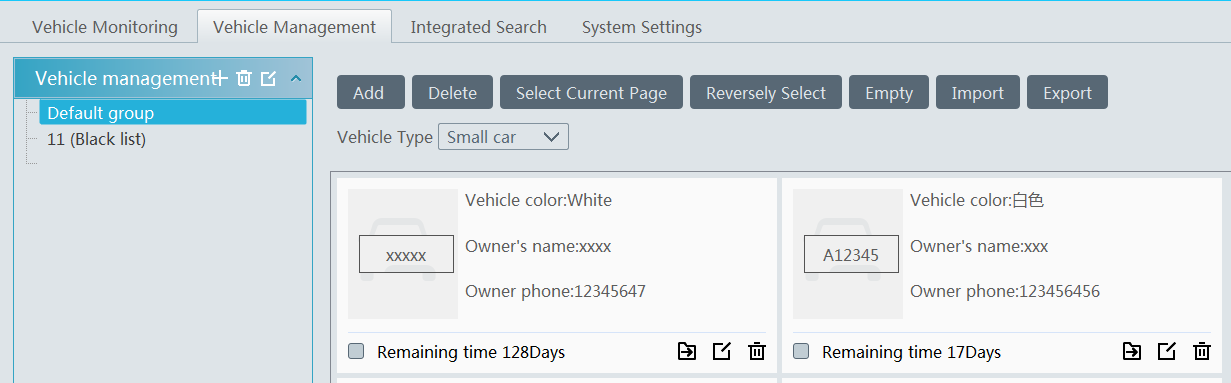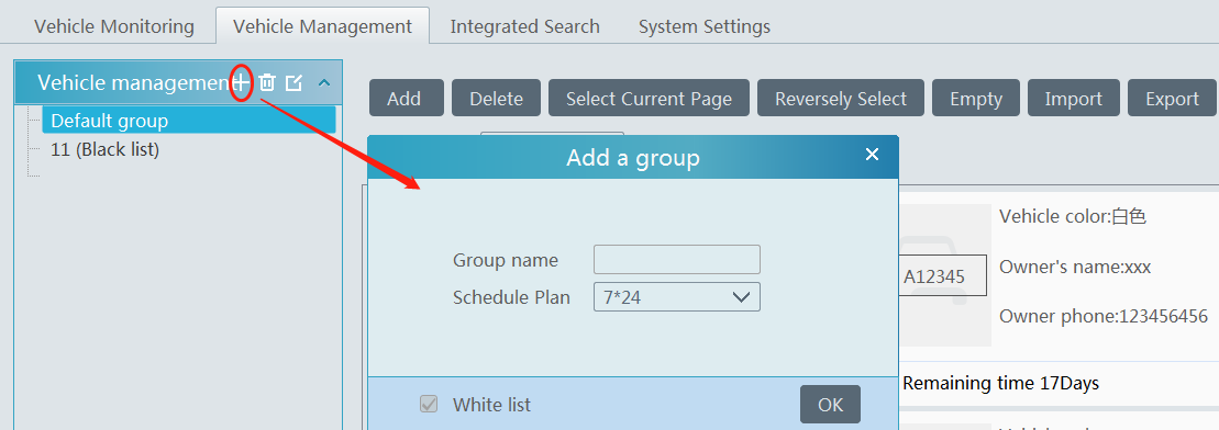 In the vehicle management interface, you can add or delete the vehicle group and add vehicles to the vehicle group. There are two default vehicle groups: the whitelist group and the blacklist group. These two default groups cannot be deleted. You can add other whitelist groups as needed.