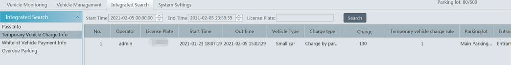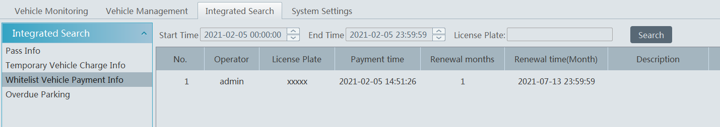 Go to Start>Parking Management> Integrated Search for Payment Information for Vehicles on the White List. Payment information of the whitelisted vehicle can be viewed as shown below.