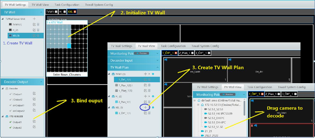 Support decoding on TV wall in the audio format of G.722, G.711A, G.711U or ACC - Supports live view and playback on the video wall
