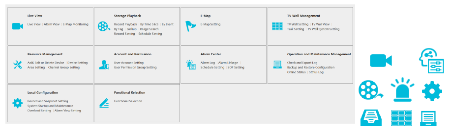 With the powerful capability of video surveillance management, real-time preview, record storage, record playback, record download, alarm linkage, decoding on TV Wall and keyboard control are supported.