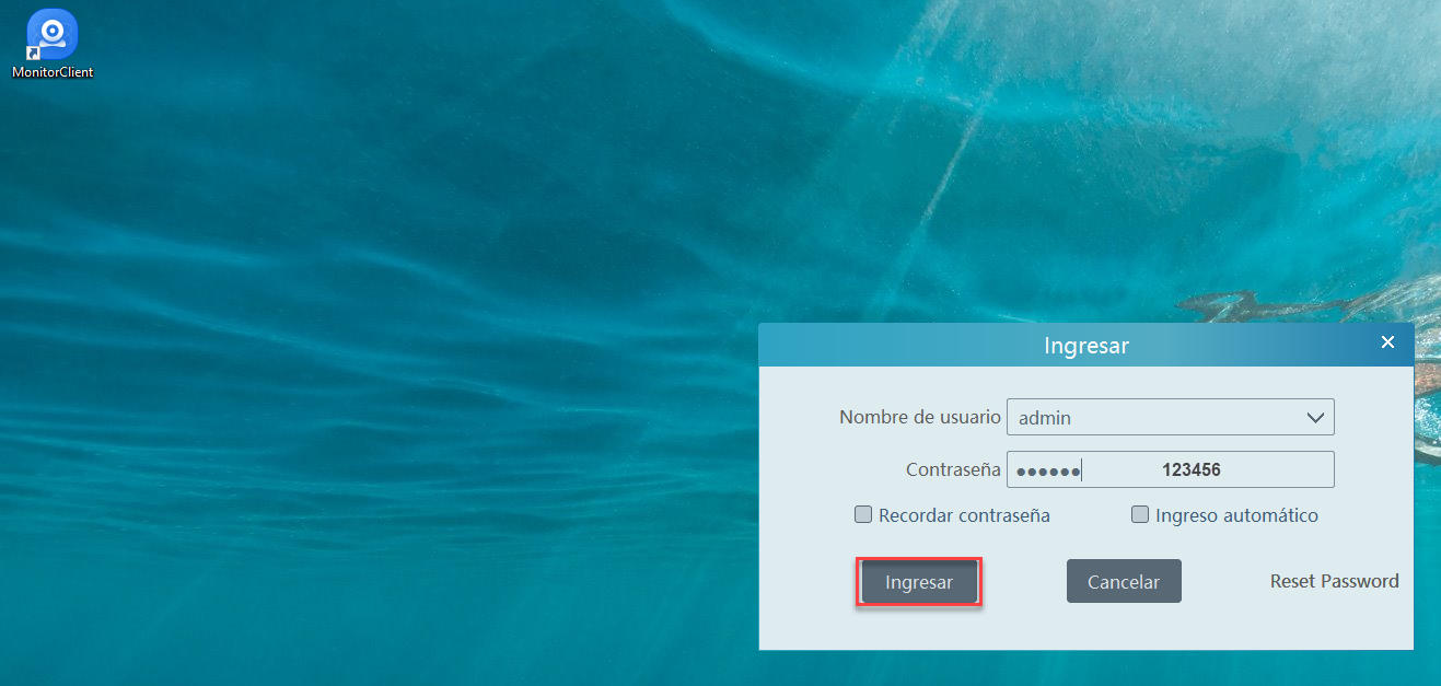 - We enter the data to access the software that is factory set User: admin Password: 123456 and press enter.