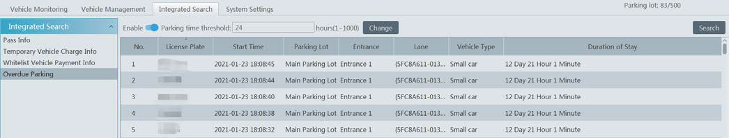 Enable this function, enter the parking duration, and click [Search] to display the detailed information of the overstayed vehicles, such as license plate number, entry time, and duration.