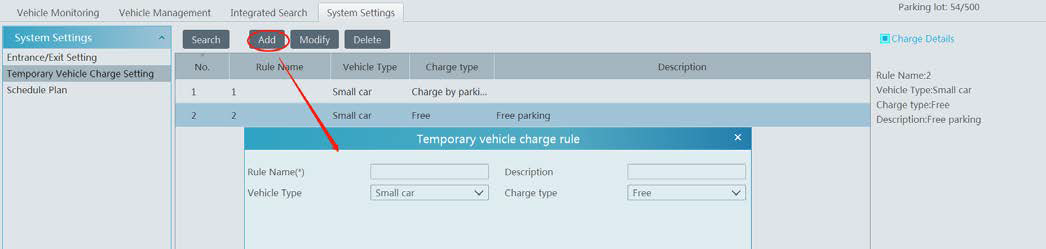 The charging rules include “Free”, “Charge for each exit”, “Charge for parking time” and “Custom Rules”. Configure the charging rules according to your needs.