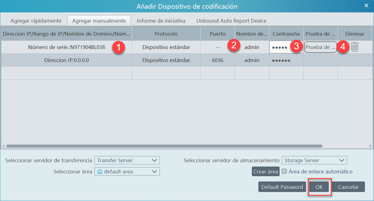 - In this box we will enter the data of the Serial Number of the recorder (Serial QR Code), username and password used to enter the recorder and at the end do a connection test, after it is successful, press the OK button. and we just wait for the equipment to come online.