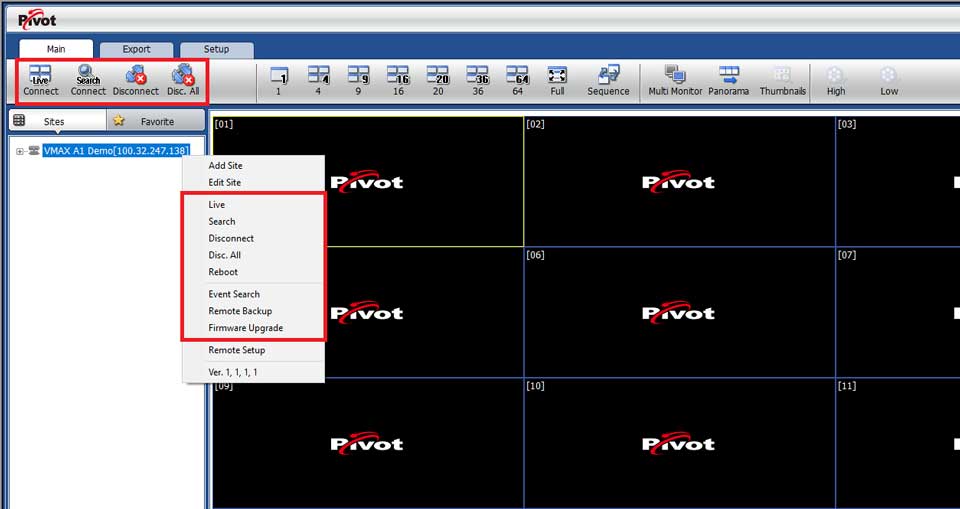 When using Pivot CMS, each connection to your recording device requires the network and login information to stream video from the recorder. Users will need to create Sites to enable the ability to connect and monitor devices from a personal computer. Once a connection is established through a Site, depending on their assigned permissions, users may monitor live camera video, playback previously recorded footage, export footage, and upgrade firmware (depending on the recorder model) through Pivot CMS.