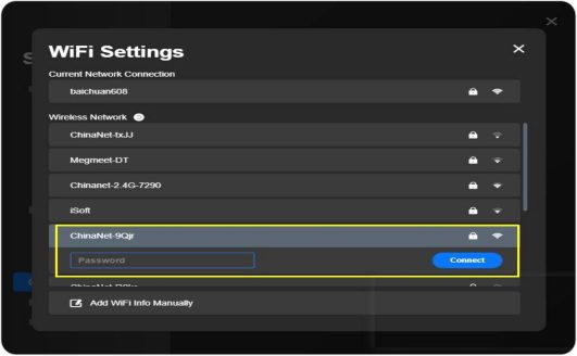 Step 2. Please select the SSID (network name) of your router that you would like to connect and type in the WiFi password. Please make sure you type in the correct WiFi password, and note the distinction between uppercase and lowercase letters, and special characters. Then, click Connect to save the setting.