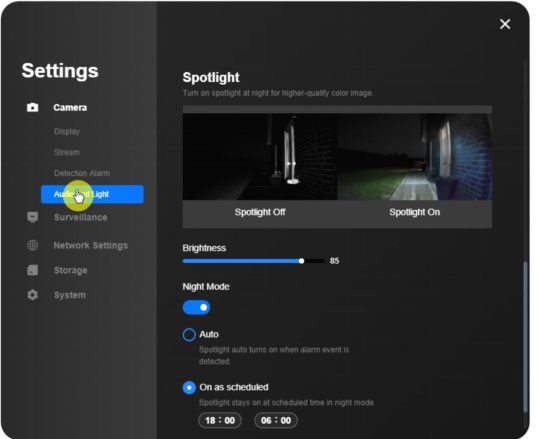 You can manually adjust the brightness of the spotlight, and if the Night Mode is enabled, you can choose Auto or On as schedule.