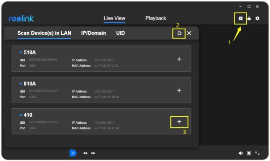 Step 1. Launch Reolink Client, click “+” icon on the right top corner, then the Refresh icon, and then choose the device you want to add.