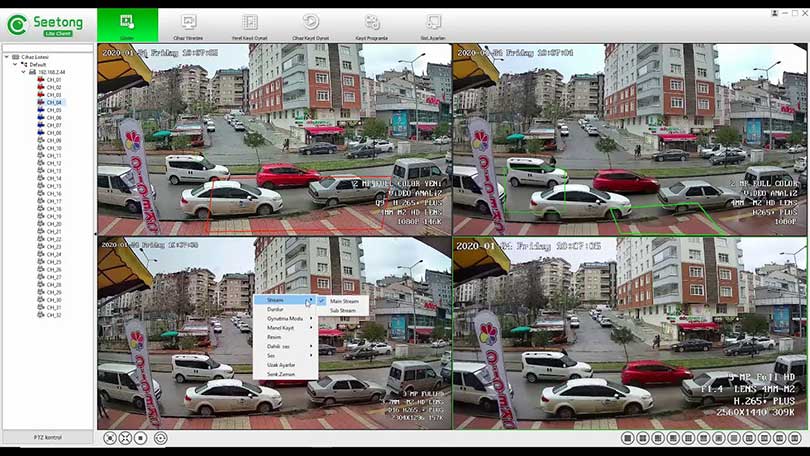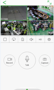 Add device to video play window and check real time video , user can choose 1 or 4 split screen ways. User can monitor ,talkback and record during video playback.