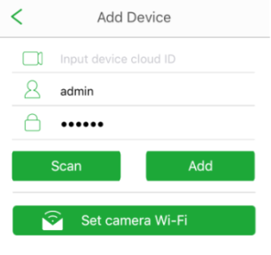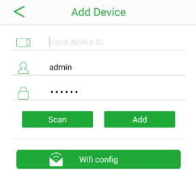 Click upper right corner button then enter into device add interface, input device cloud ID number ,account and password . After finishing ,click “add’ button, only information is correct, it can add normally. User also can scan R code to add device .The added device will be added automatically. The user name : admin ,default password is 123456 as the picture below: