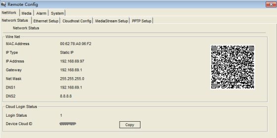 In order to simplify operation, our software added the function through scan QR code to add device function. Firstly user need visit device local LAN IP address, then enter into device webpage, there is a QR code in network state of network configuration as the picture below. Open client Seetong ,click scan QR code to add device automatically