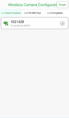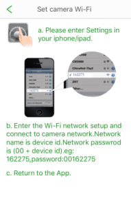 Search the device ID you need change ,click . For example : 526806 is device WIFI ID, connect network of 526806 and enter into WIFI password interface ,input Wi-Fi password ,click next step, it will remind you that WIFI configuration is successful