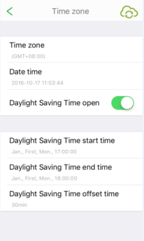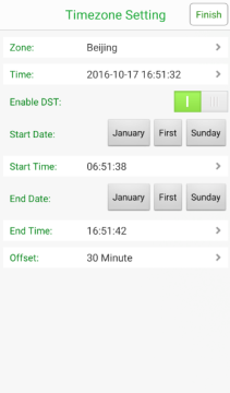 When device support time zone setting, user only need start daylight saving time setting button ,he can set out –of line time ,start and finish time and date. After configuration success, click store “store ”button , user can enter device to preview time as the picture below :