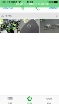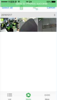 User can export recording into mobile for watching any time ,click “” button,the interface will give hint“succeed share and save in album ”, then recording will export into mobile phone album and check any time