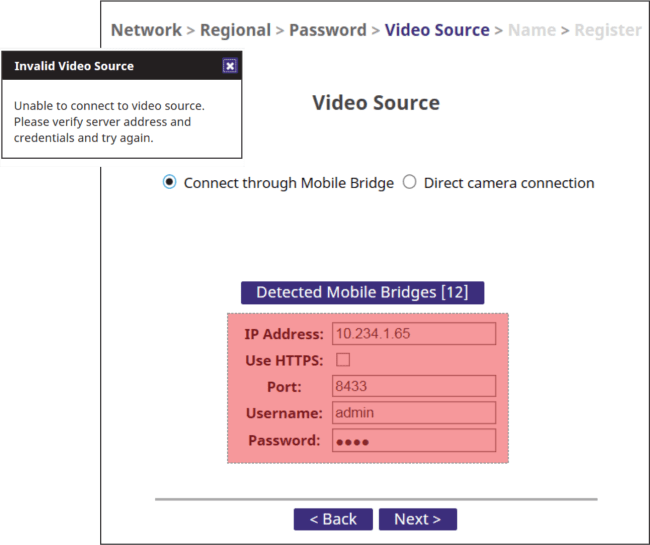 The Thin Client cannot connect to Mobile Bridge, and you see an Invalid Video Source error when setting up or re-configuring the device as follows: “Unable to connect to video source. Please verify server address and credentials and try again.”
