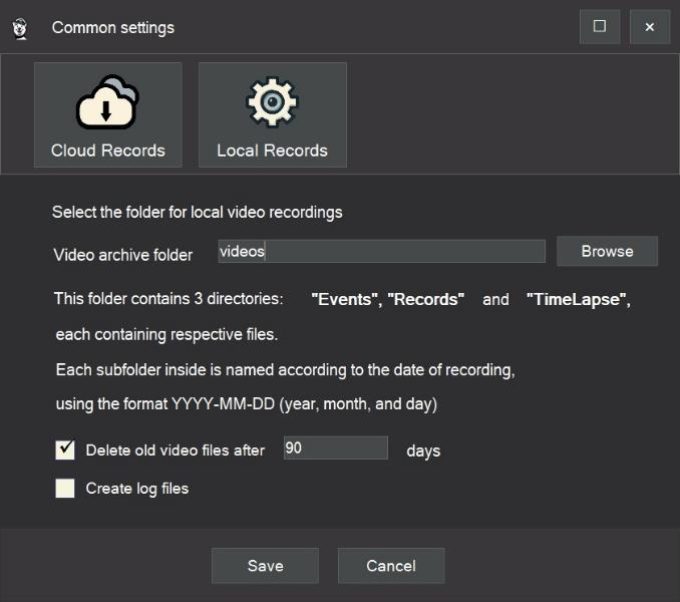 In the general settings, you can select a directory for the “videos” archive where video files will be saved during recording.