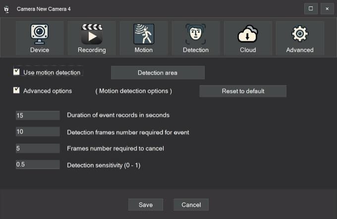 The sensitivity of the motion detector is configured in Advanced Options.