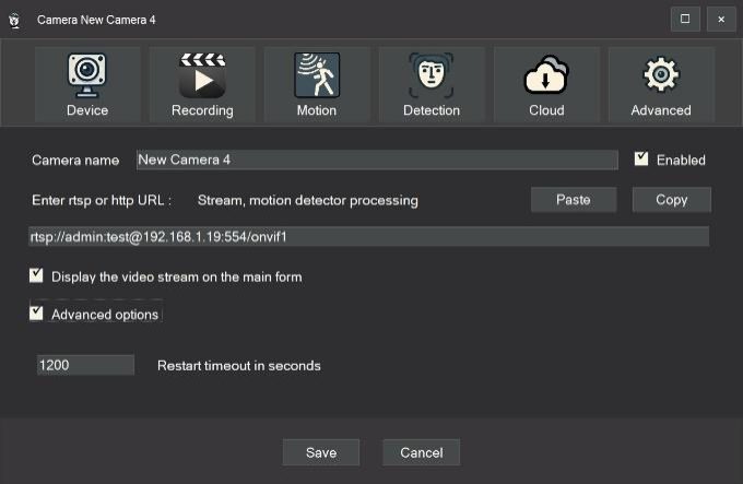 • Device: General camera settings (camera name, RTSP stream address).