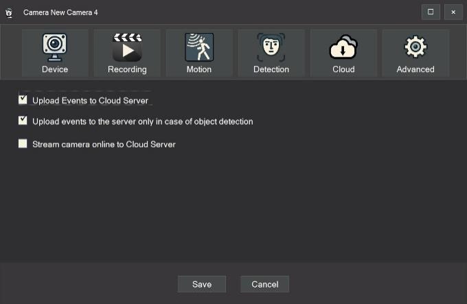 To record events to the cloud server, enable the option “Upload Events to Cloud Server.”