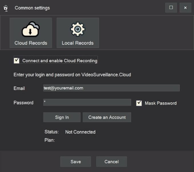In the general settings, enter your email and password at cloud service, and in the camera settings, select the option “Stream camera online to cloud server.”