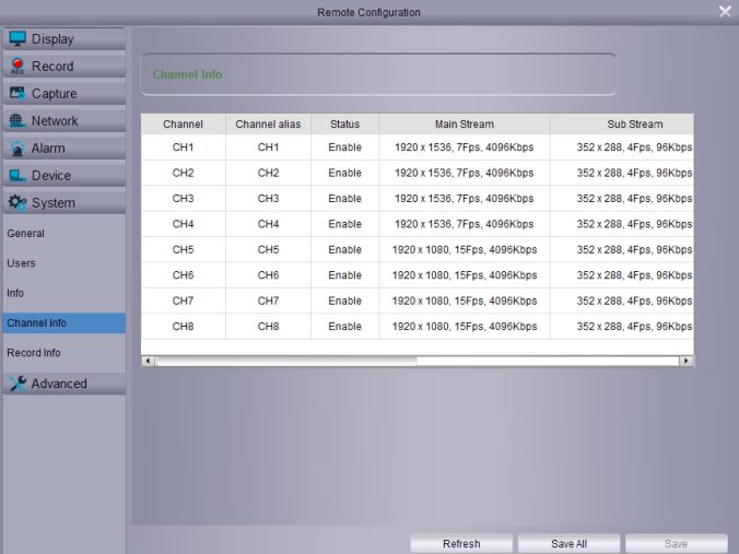 The Channel Info and Record Info tabs display the Main Stream, Sub Stream and recording settings used for each camera connected.
