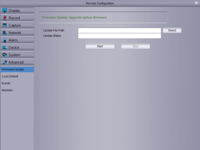 Update File Path: Click the “Select” button to load the firmware, click “Open” to confirm then click “Start”. When the firmware upgrade has completed, your DVR or NVR will reboot automatically.