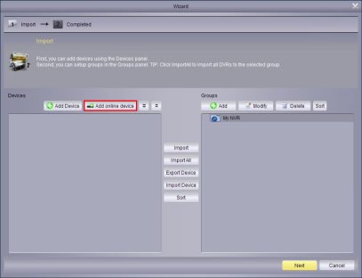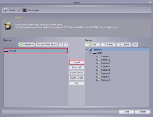 Click your device then click the “Import” button. Your DVR or NVR will be added to the Groups panel. Click the button next to “My NVR” to display the channels available.