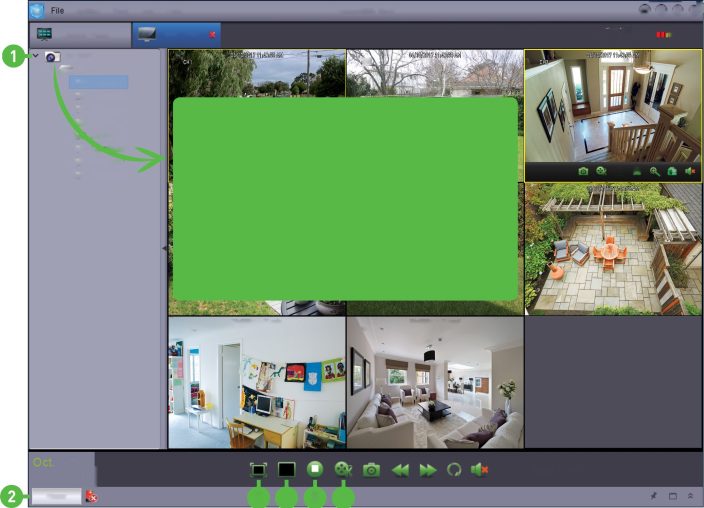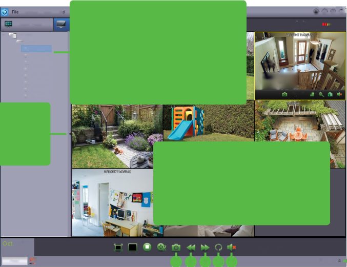 8 & 9. When viewing a single camera or a group of four cameras, click these buttons to view the previous or next camera or group of cameras.
