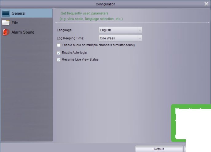 System Configuration: Change configuration settings for the software such as save location for videos and snapshots, language selection and log keeping duration.