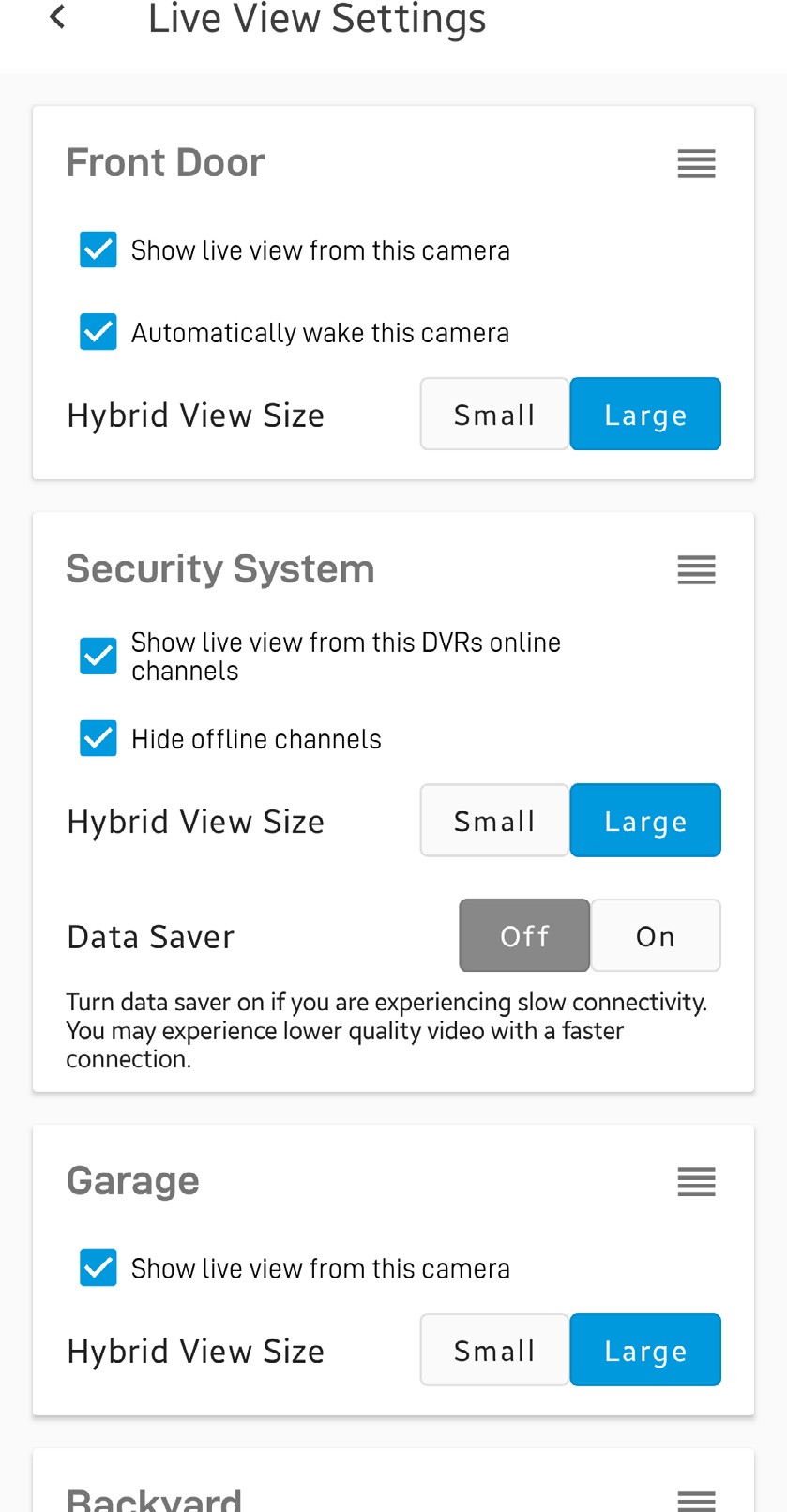 (NVR only) You can turn the Data Saver feature on or off. If your internet connection is slow, we recommend turning this feature on to improve the live streaming performance of your NVR cameras–the app will use “Mobilestream“ as the default live video quality setting. For more details, refer to the instruction manual of your NVR system.