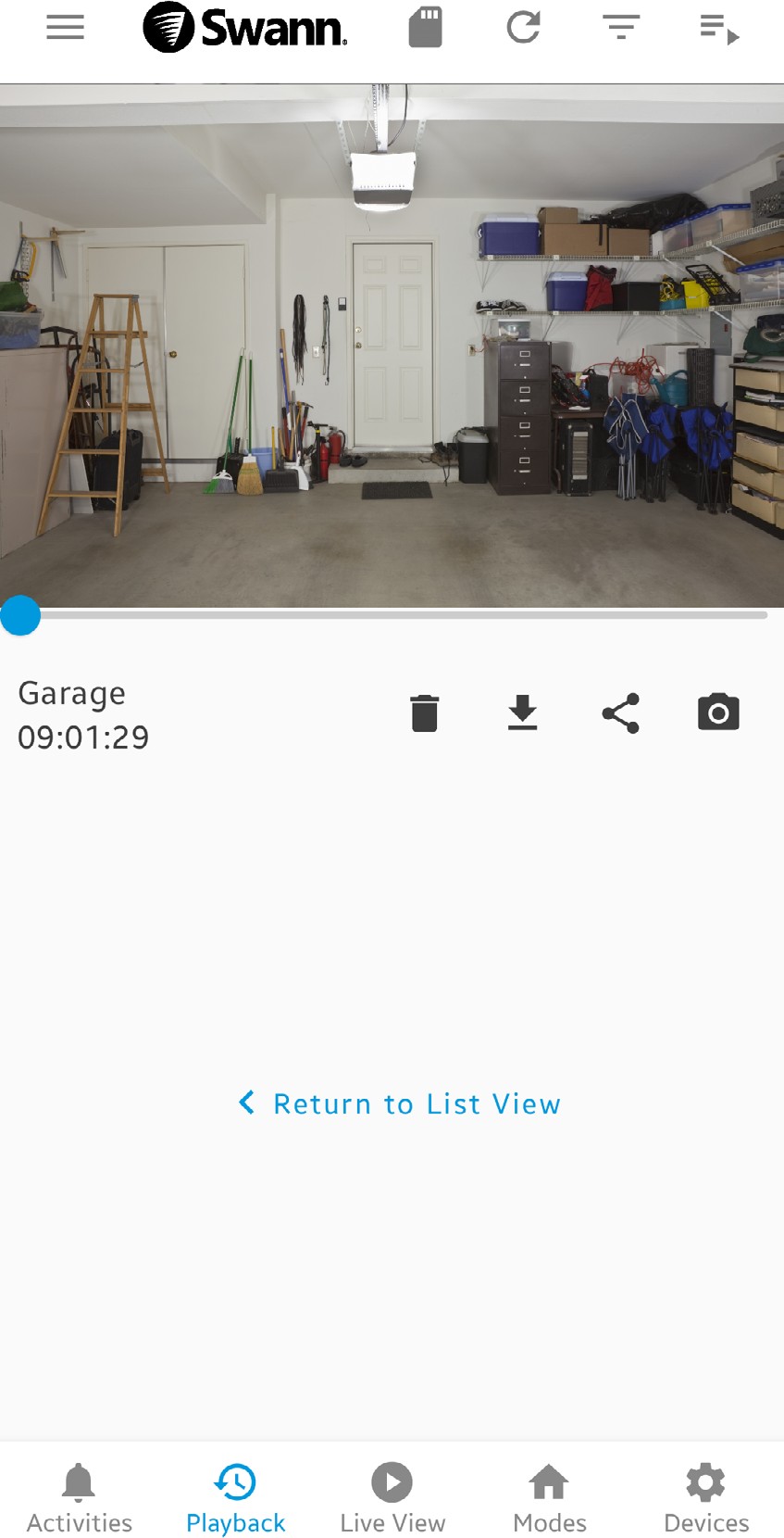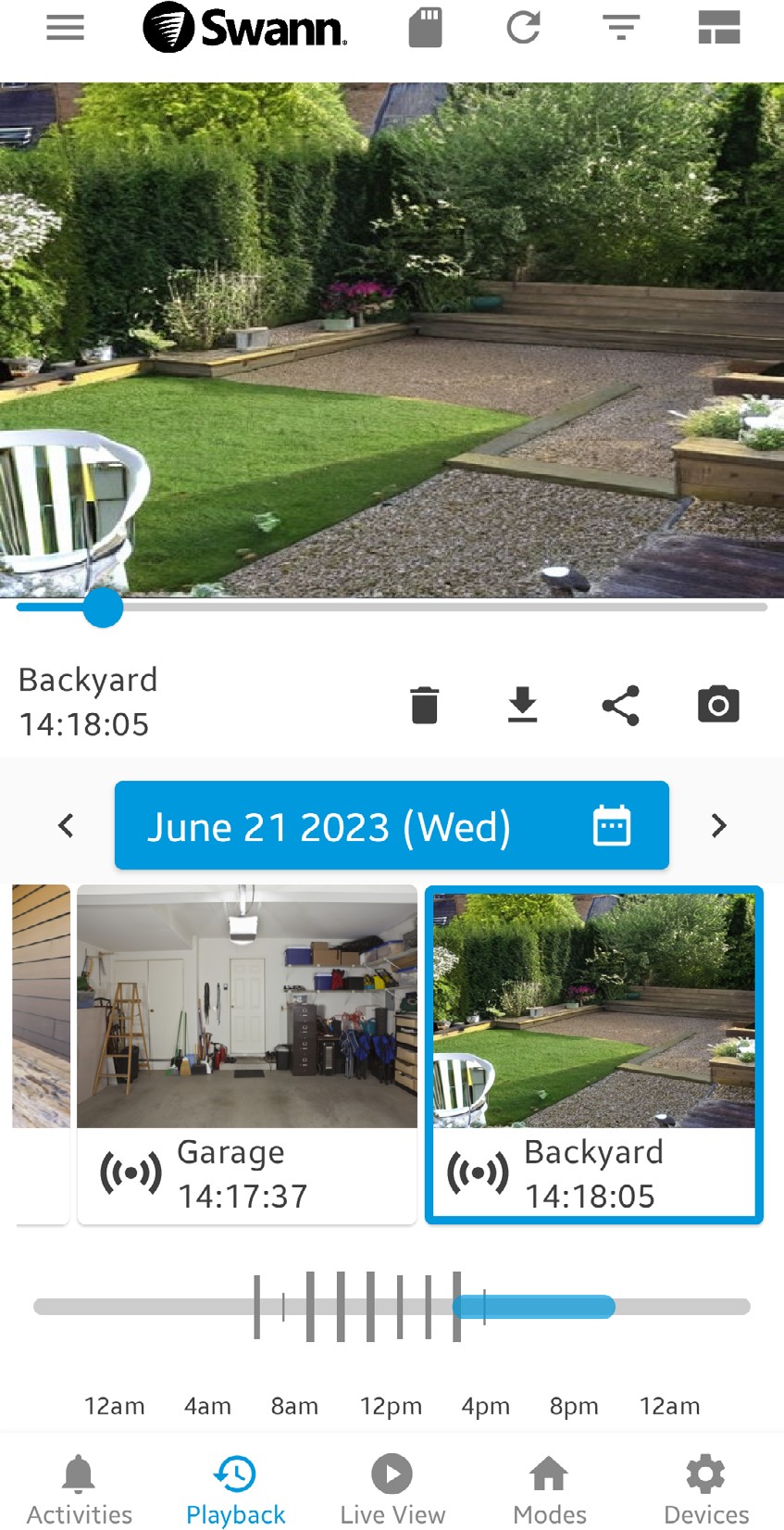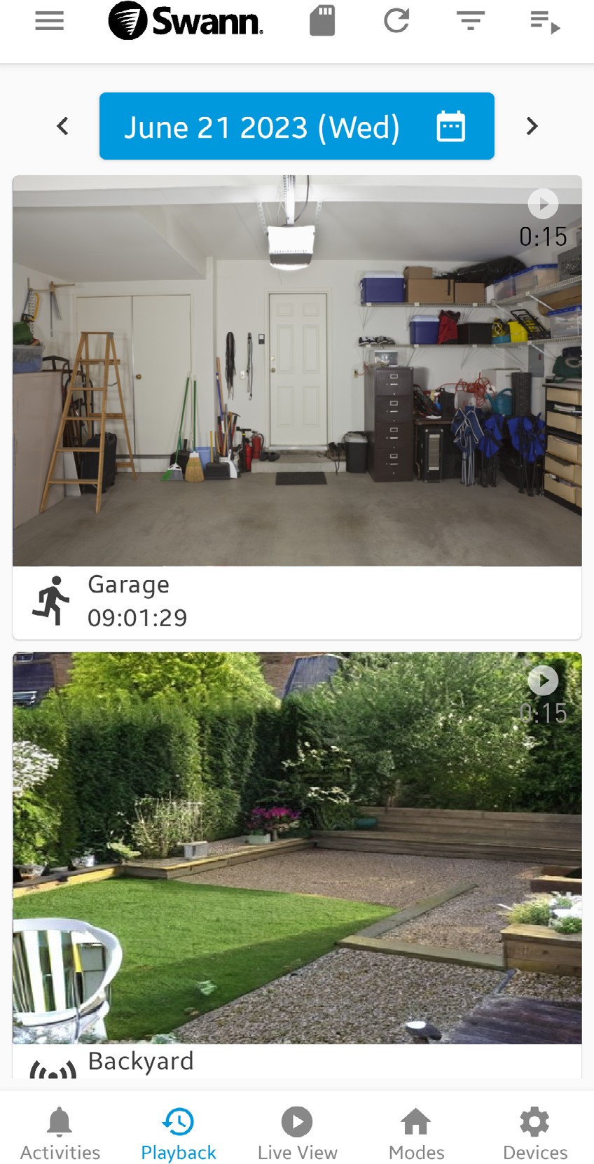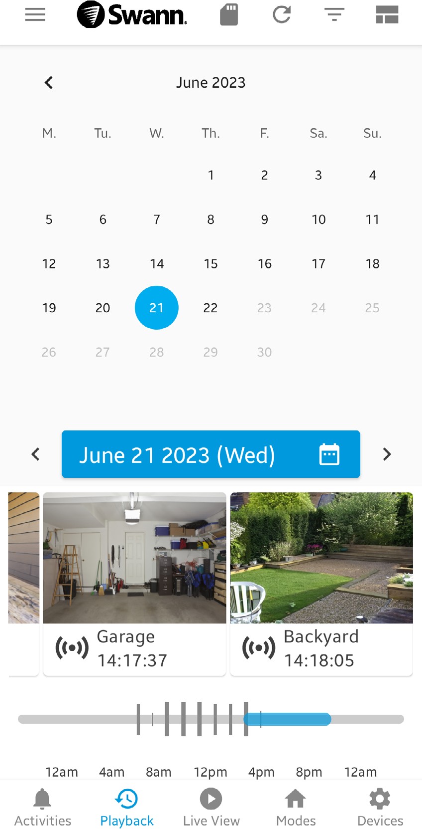 By default, the list of today’s camera recordings is displayed. Depending on the type of devices paired, this may include recordings stored in the cloud, live recordings, as well as those located on the DVR/NVR. For SWIFI camera models that only have microSD card storage, such as the TrackCam, please refer to 2 below. You can also view camera recordings from a different date, simply tap here and select the desired date using the calendar or tap the left or right arrow to view the previous or next day’s recordings.