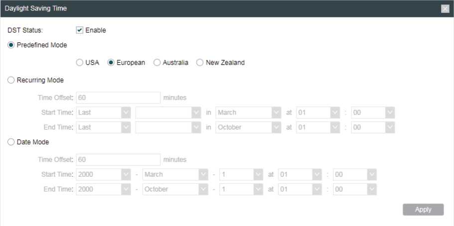 Select Predefined Mode and select the predefined daylight saving time schedule for the device.