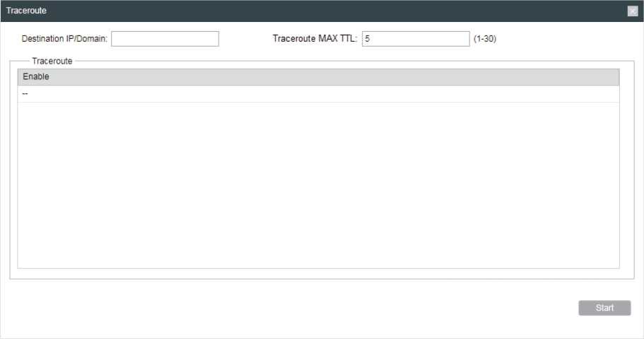 Enter the IP address of the destination node for Traceroute test. The device will send Traceroute packets to test the network connectivity and reachability of the host and the results will be displayed in the Traceroute. |